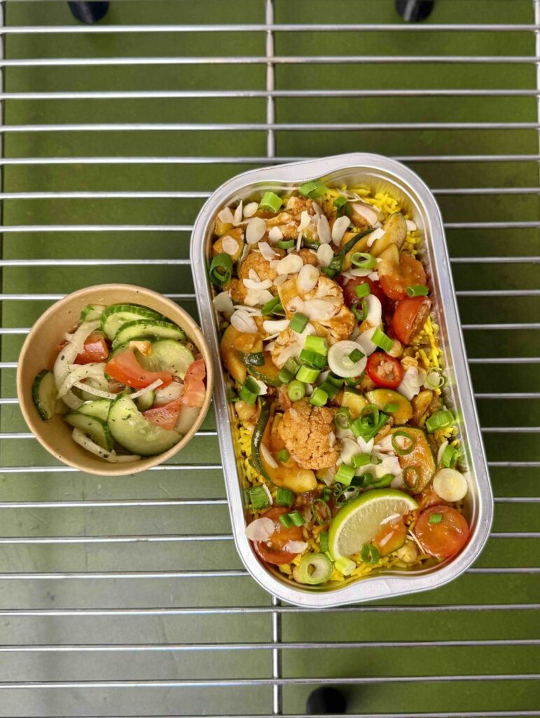 Rijke curry van gepofte cherrytomaatjes, rijpe tomaten, ui, kikker- & tuinerwten, geroosterde bloemkool & zoete aardappel in en saus van tomatenpuree en kokosmelk vergezeld door gele rijst afgetopt met gebakken uitjes.